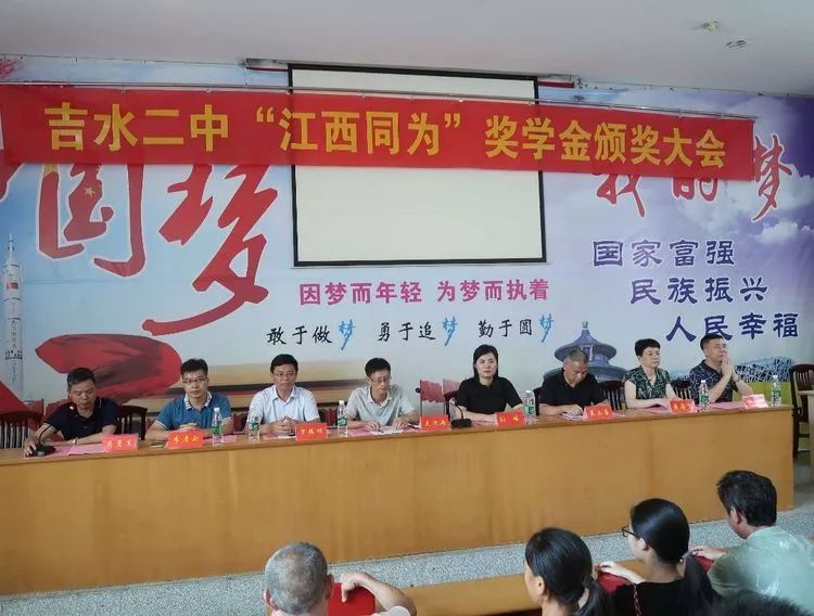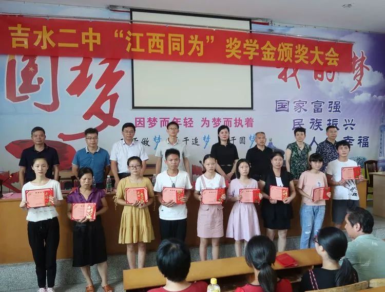 7月24日,吉水二中新多媒体教室内气氛热烈,学子们从领导手中接过荣誉证书和奖金,这是学校正在举行“江西同为”奖学金颁奖大会,县教体局龙迎海副局长、李清云副局长出席,江西同为科技有限公司代表孙梅、黄海文女士参加,罗腾根校长、夏立喜书记、郭火斌副校长在主席台就座,肖贵生副校长主持,获奖学生及2020届部分学生代表参加。
