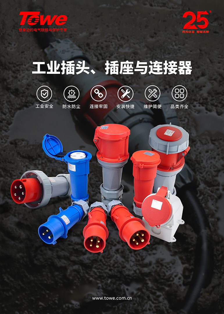 工业连接器作为电气系统的重要组成部件,在工业自动化、设备制造、能源系统、数据中心与机柜配电等领域发挥着关键作用。随着工业现场环境复杂性和设备集成度不断提高,连接器的性能指标、选型标准与应用场景也变得更加专业化、多样化。同为科技(TOWE)在工业连接器及配套插头插座领域布局多年,其产品线覆盖了从16A、32A到63A、125A等多种规格的工业连接器,能够满足广泛的应用需求。根据工业连接器产品主要分为不同电流等级和极数的插头插座系列,适用于室内外不同安装环境。