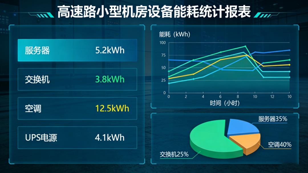 再者,智能PDU助力小型机房实现能耗精细化管理,契合高速路机电系统“绿色改造、节能降耗”的发展趋势。在双碳目标指引下,高速路机电系统建设改造不仅追求设备稳定性与智能化,更注重能源利用效率的提升。小型信息中转机房虽单机房能耗不大,但路网内数量众多,累计能耗不容忽视,而传统PDU无法实现能耗精准计量,导致机房存在“能耗黑箱”,难以开展节能优化。智能PDU内置高精度电能计量芯片,可精确统计总能耗与各设备分回路能耗,自动生成小时、日、月能耗报表,支持数据导出并对接机电系统的动环监控平台,让每一台设备的耗电量清晰可查,帮助运维人员精准识别高耗能设备、“僵尸服务器”及过载回路,优化负载分配,避免“大马拉小车”的能源浪费。同时,智能PDU可设置定时开关功能,对非核心设备进行定时断电,减少无效待机能耗,其自身待机功耗低至≤1.5W,远低于行业平均水平,长期运行可实现显著的节能效果,助力高速路机电系统实现绿色改造目标,降低整体运营成本,推动路网运营向“节能化、低碳化”转型。