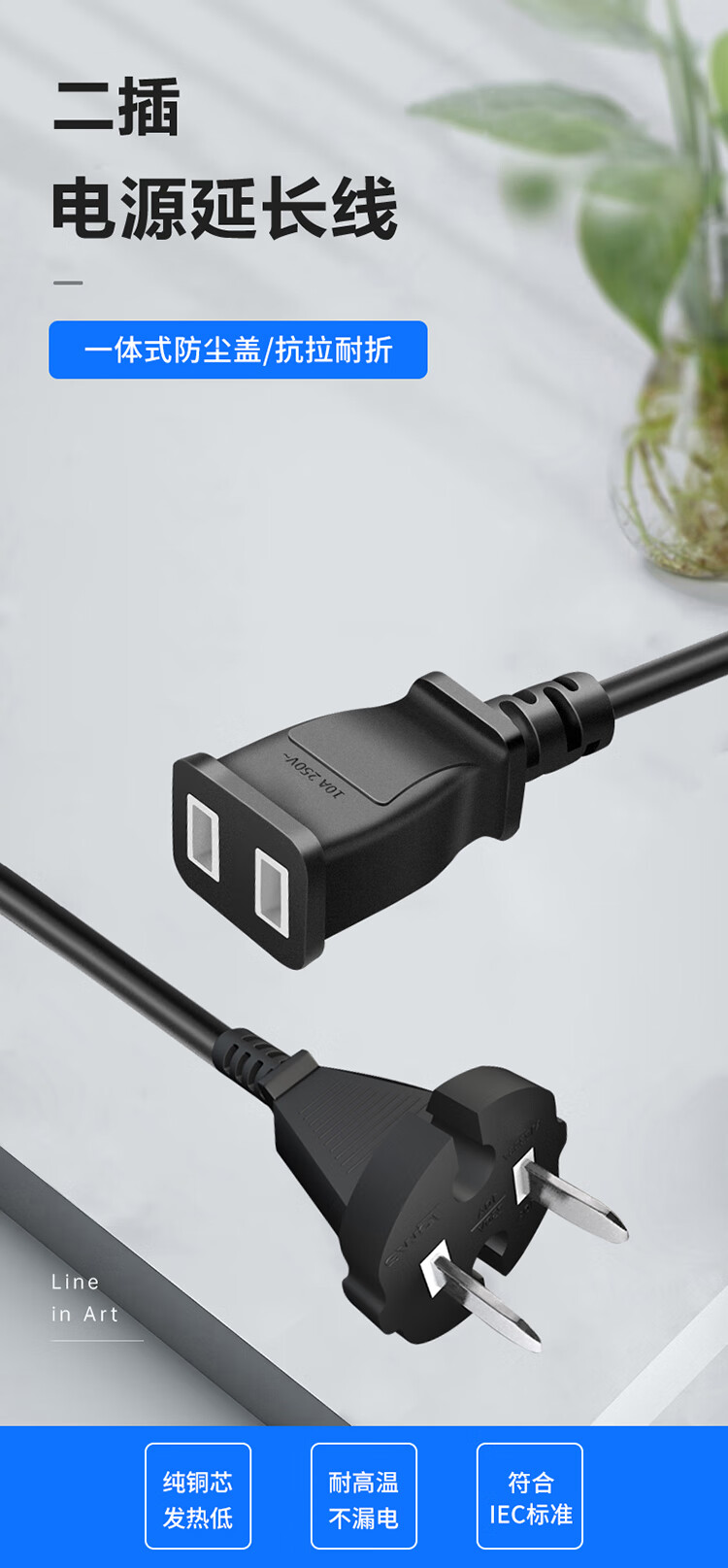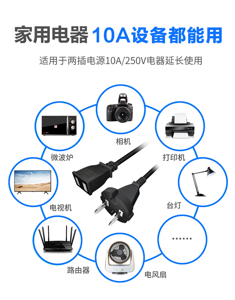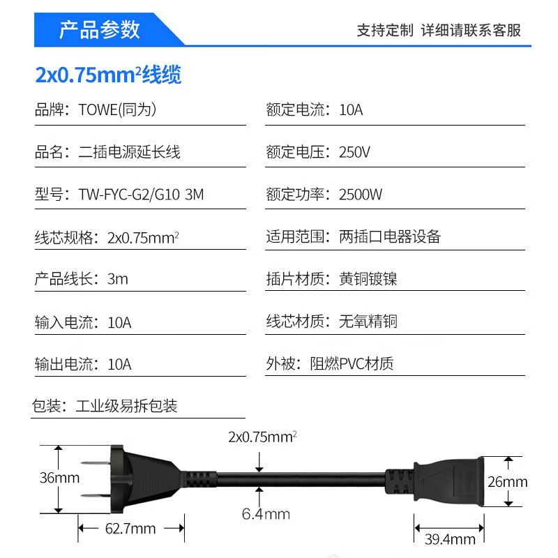 TOWE同为国标10A二芯二插电源延长线插座用于电视、PAD、相机、充电器等设备TW-FYC-G2/G10 3M