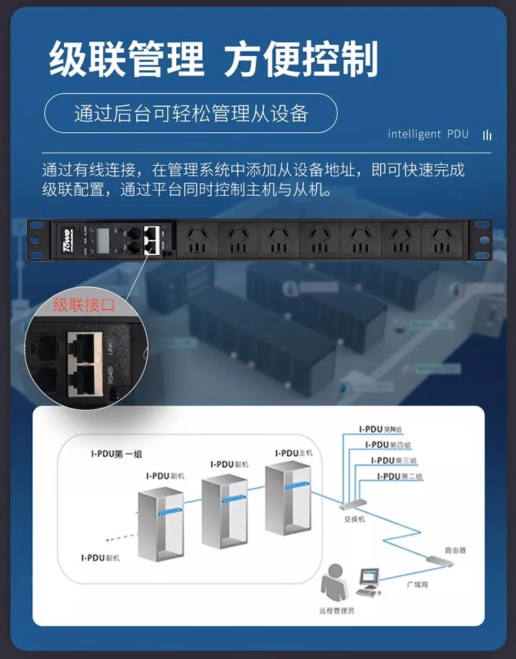 智能款 i-PDU 搭载嵌入式控制系统,支持端口级独立控制、远程开关机、定时上电、负载优先级调度,可通过 Web、SNMP、Modbus TCP、RS485 等协议接入 DCIM、动环监控平台;实时采集电压、电流、功率、电能、温湿度等参数,精度达 ±1%;提供多级阈值告警,支持声光、邮件、短信、平台推送,异常秒级响应,实现无人值守机房的主动式运维。产品通过 3C、CE 等国际认证,满足高密机柜、7×24 小时连续运行的严苛要求。