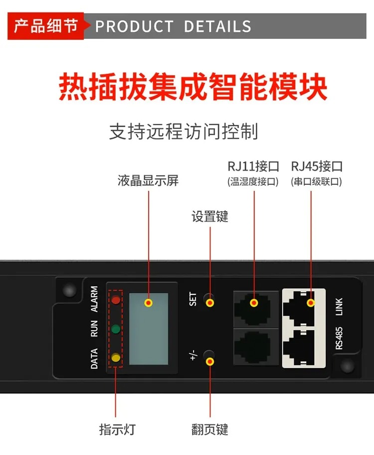 · 远程监测控制(部分型号):通过485串口连接到电脑,智能PDU提供通讯协议支持查看当前电流、电压、有功功率、无功功率、视在功率、频率、PF值、电量等参数。也可设置485端口号、电流报警基准参数(0-63A任意值)、电压报警基准参数(90-260V任意值)、继电器通断显示及控制等参数。